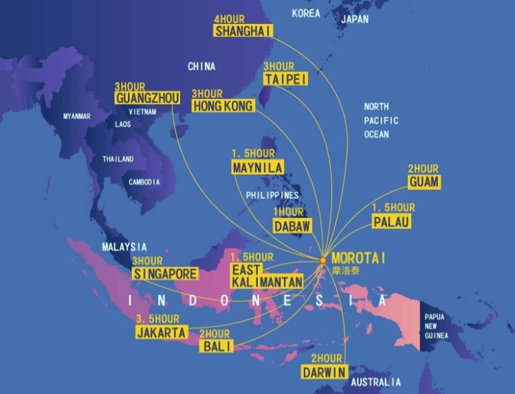 摩洛泰島位於印尼最北方的島嶼之一,面積2400平方公里,在菲律賓南方,峇里島北邊,介於中國、台灣和澳大利亞的 中心。有平原、山丘、海岸、白沙灘、紅樹林。為東印尼的國際門戶及亞太地區的國際營運中心,地理位置相優勢。